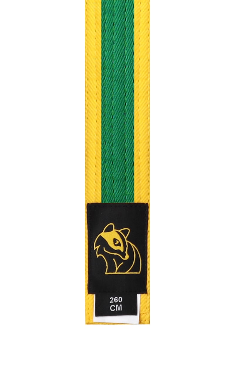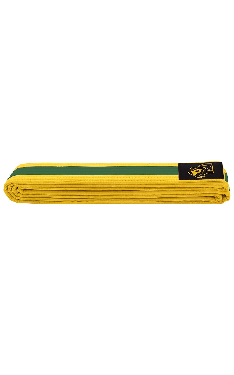 Gestreifter Budo-Gürtel von DAX. Optimal für Judo, Karate, Taekwondo, Ju-Jutsu und weitere Kampfsportarten. Satte Farben und sehr gute Verarbeitung zeichnen diesen vollwertigen Kampfsportgürtel aus.